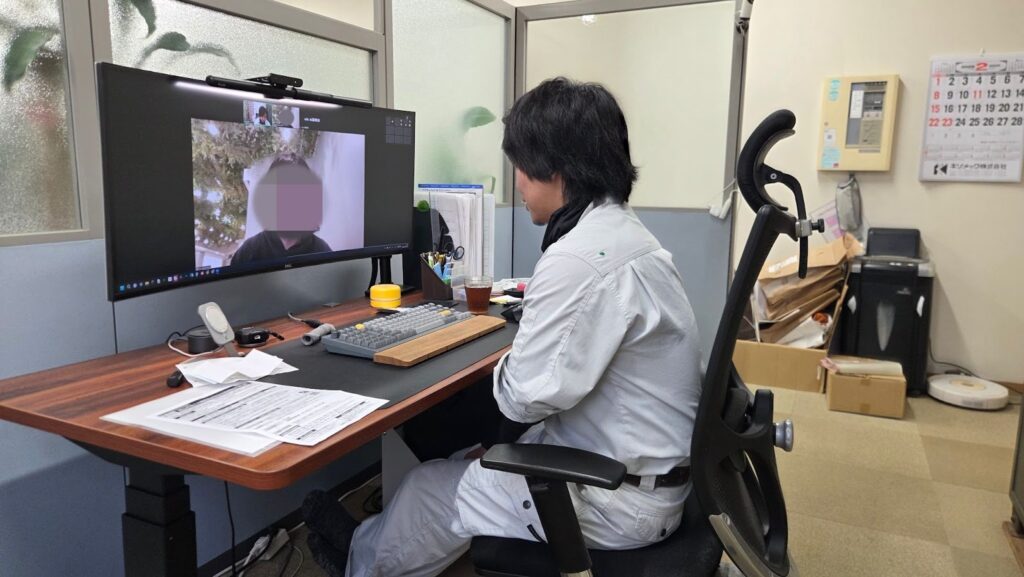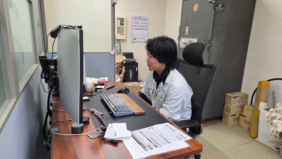 あれから1年。現場で自ら図面を書き、ものづくりを通じた業務改善を次々と実行する頼もしい存在となった岡崎さん。